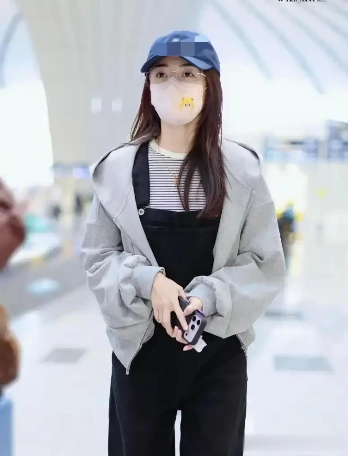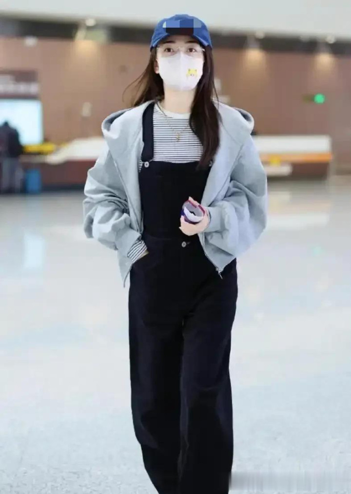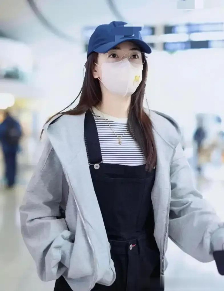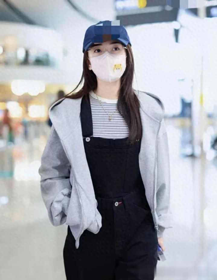 31岁梁洁机场穿搭“好少女”, 卫衣+背带裤, 搭配眼镜如清纯女大